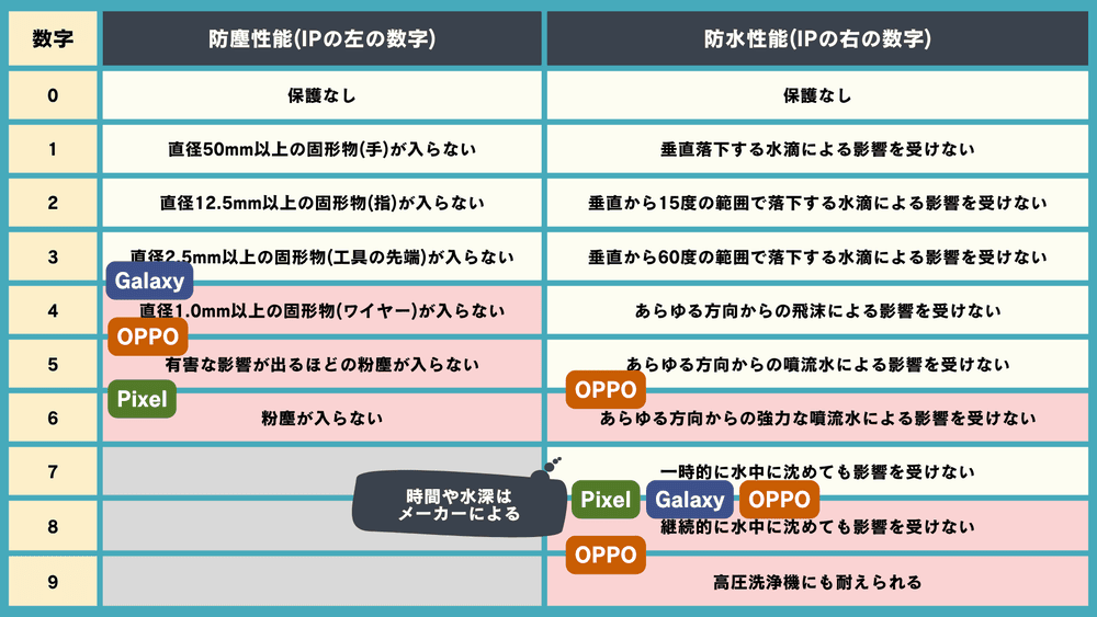 IP68とかの意味はこちらの表のとおり。