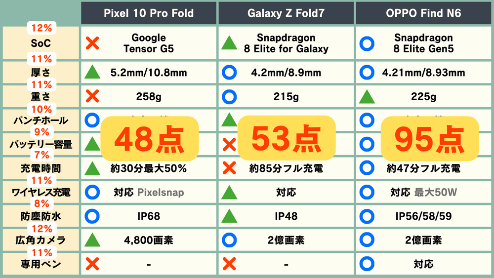 〇を1点、△を0.5点、✕を0点とすると、「Pixel 10 Pro Fold」が48点、「Galaxy Z Fold7」が53点、「OPPO Find N6」が95点になりました!