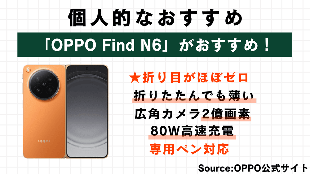 忙しい方のために、個人的なおすすめを先にお伝えすると、「OPPO Find N6」がおすすめになります!