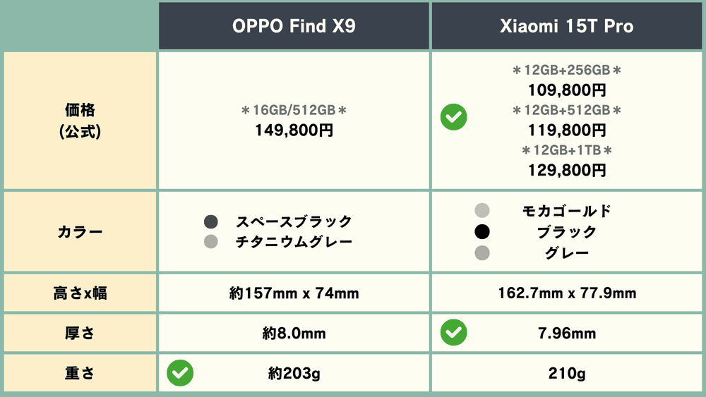 価格的には、「OPPO Find X9」の方が、同じストレージで見ると、3万円高くなっています。