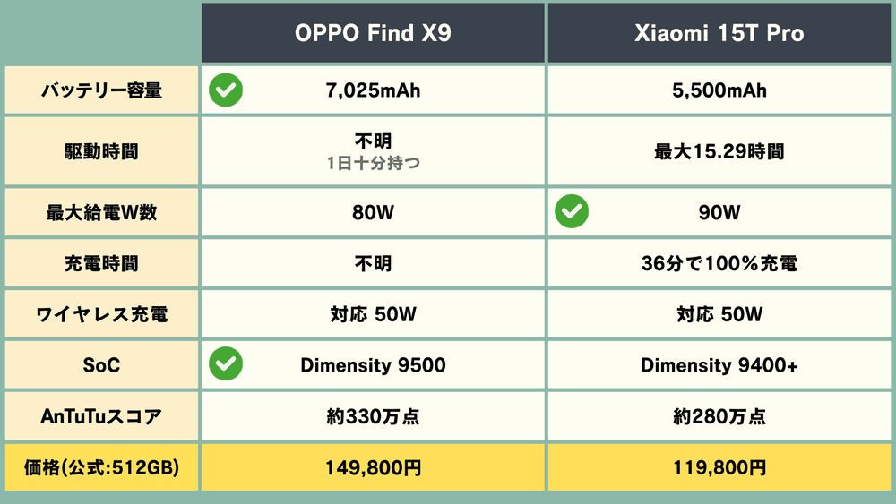 駆動時間は明確に記載がなかったので不明ですが、レビューなどを見る限り、「OPPO Find X9」の方が、バッテリー持ちは良さそう。