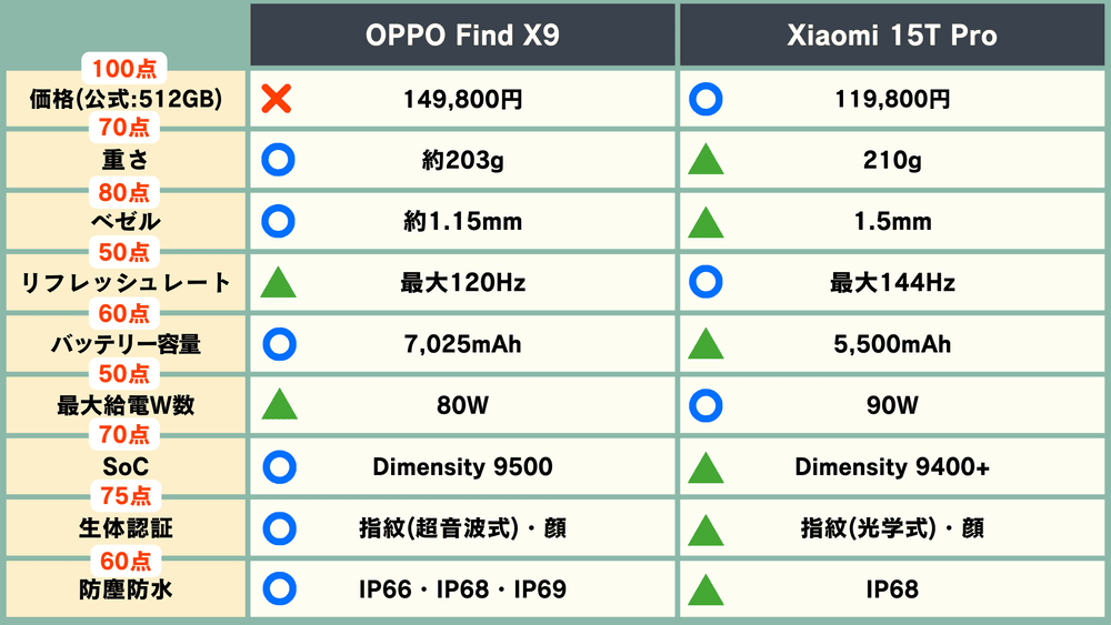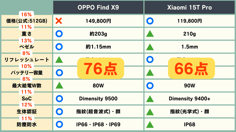 〇を1点、△を0.5点、✕を0点とすると、「OPPO Find X9」が76点、「Xiaomi 15T Pro」が66点となりました。