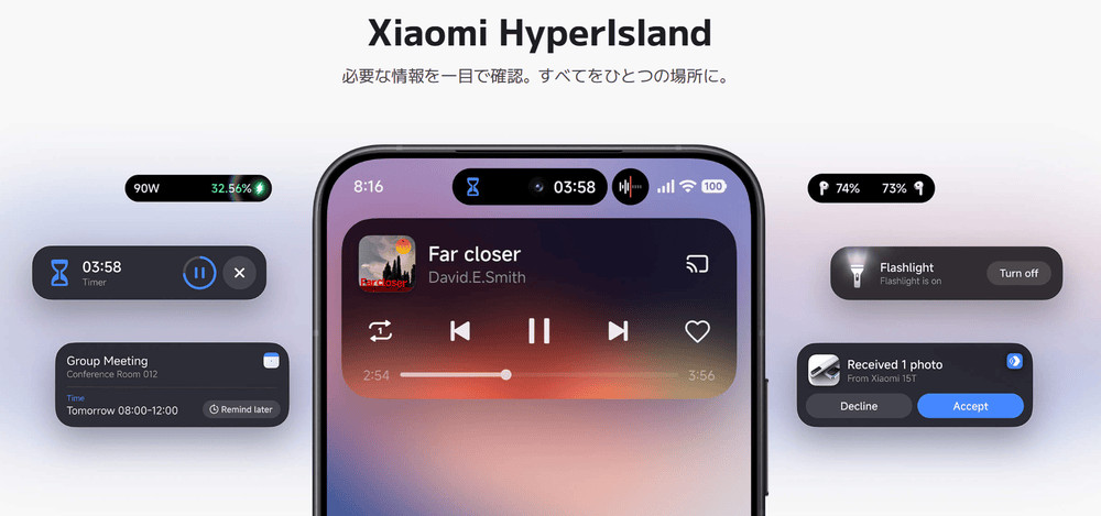 このような、「Xiaomi HyperIsland」という、なんかどこかでみたことがあるような機能が搭載されたりしています。
