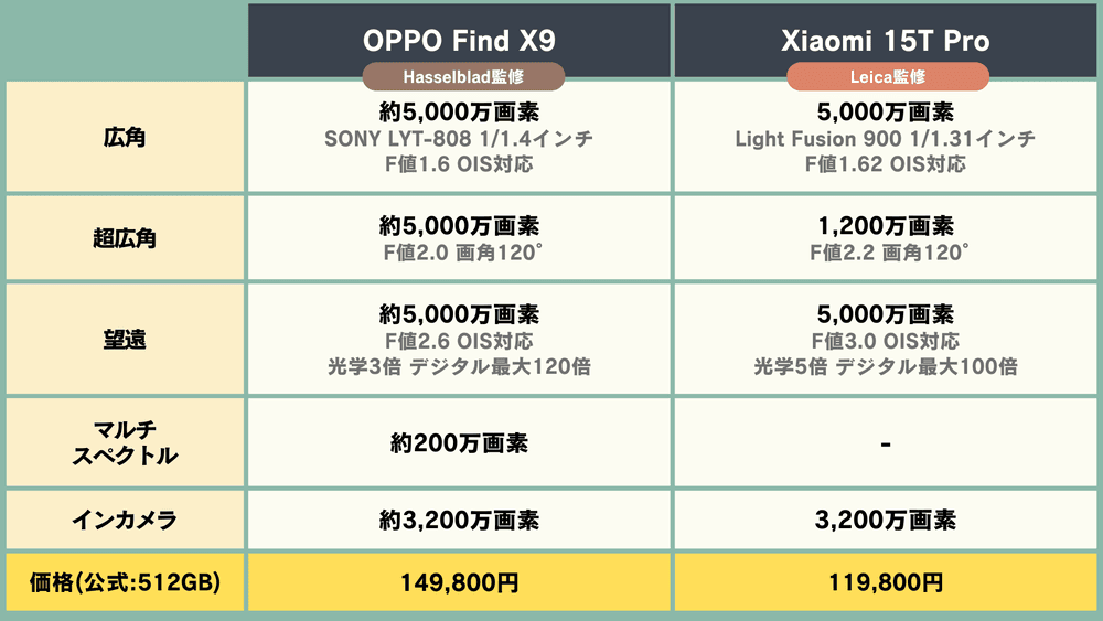 「OPPO Find X9」vs「Xiaomi 15T Pro」どちらを買うべき?【スペック比較】