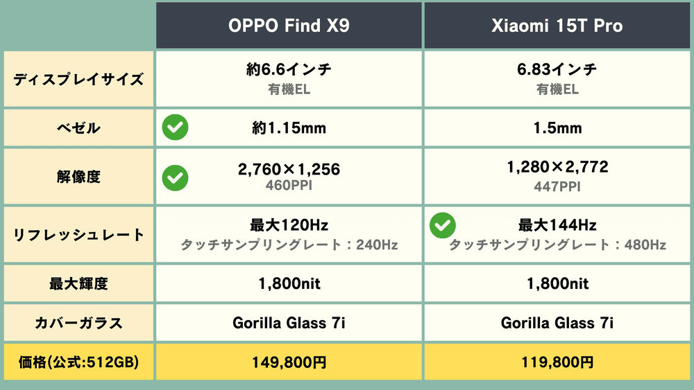 ディスプレイサイズは、「OPPO Find X9」が約6.6インチ、「Xiaomi 15T Pro」が約6.83インチ。