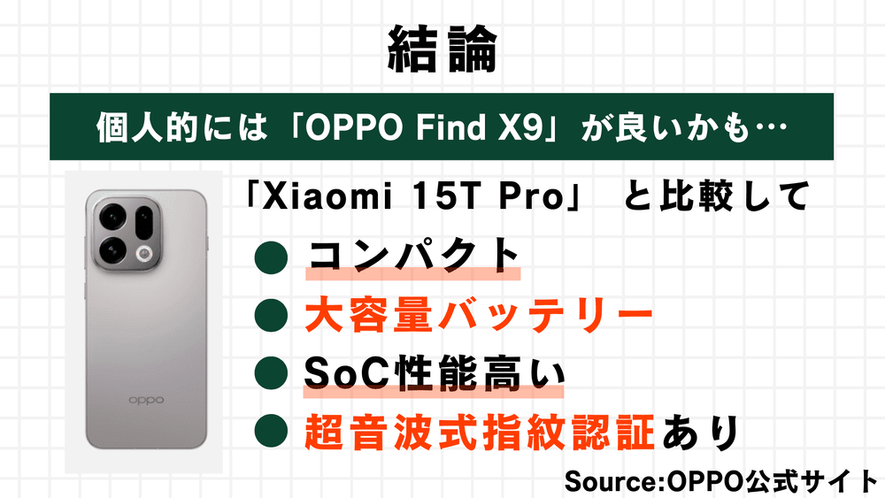 価格がちょっと高くても、細かい点で見て、「OPPO Find X9」が良いという結論になりました。