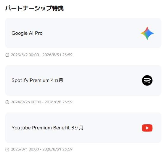全モデルで、YouTube PremiumとGoogle AI Proが3ヵ月間無料、Spotify Premiumが4か月間無料の特典付き。