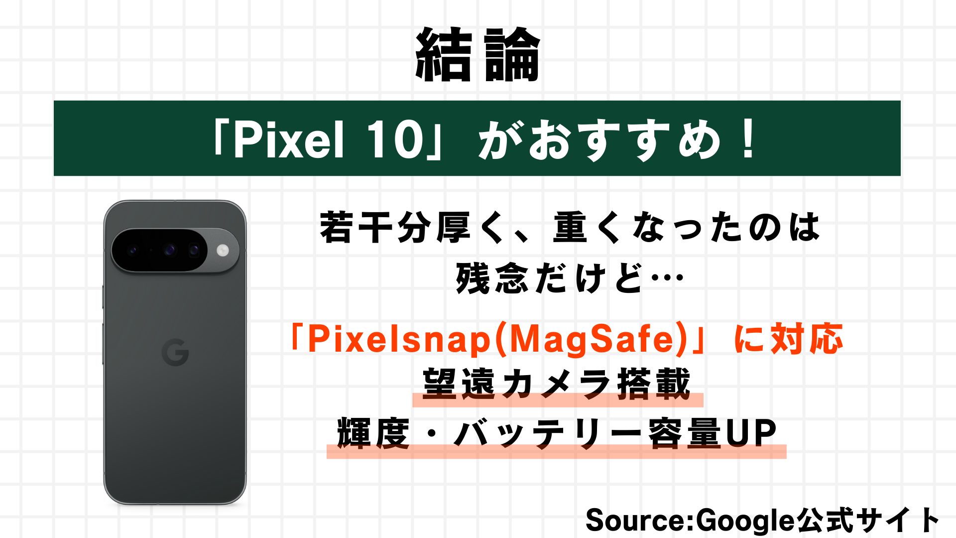 忙しい方のために今回の結論を先にお話しすると、新しく発売される「Pixel 10」がおすすめになります!