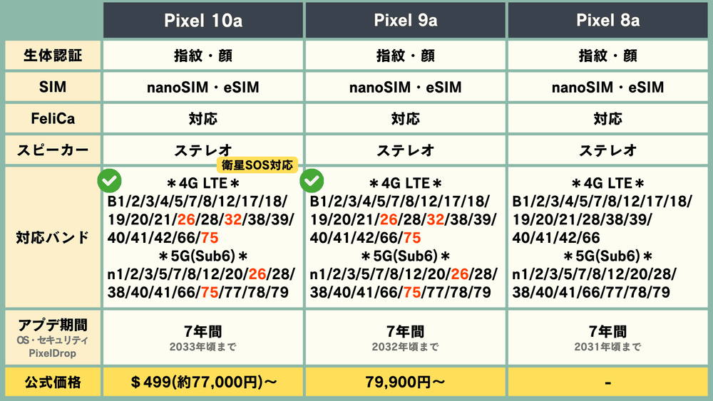 違いとしては、「Pixel 9a」と「Pixel 10a」は、「Pixel 8a」では対応していない、4G LTEのBand 26・32・75や、5Gのn26・n75にも対応しています。