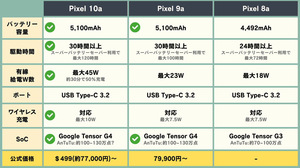 バッテリー容量は、「Pixel 8a」が4,492mAh。「Pixel 9a」と「Pixel 10a」が同様で、5,100mAh。
