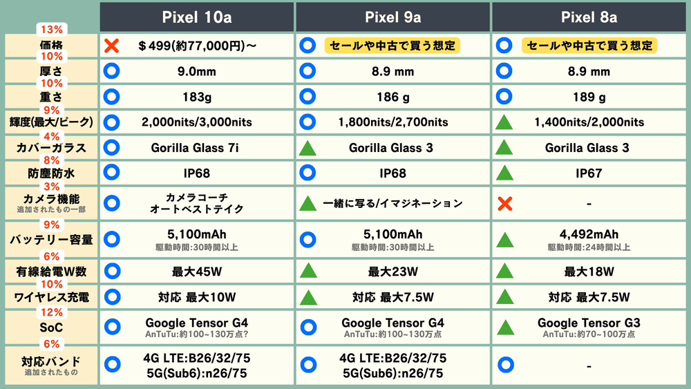 〇を1点、△を0.5点、✕を0点とすると、「Pixel 10a」が87点、「Pixel 9a」が88.5点、「Pixel 8a」が68点になりました。