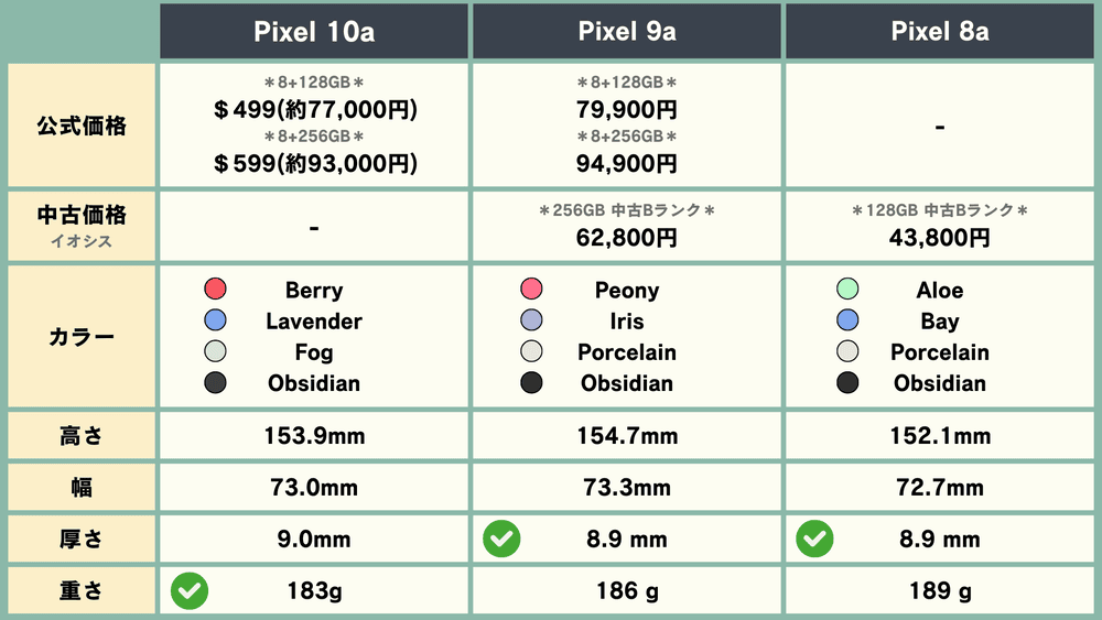 「Pixel 10a」は不明ですが、「Pixel 9a」と同じくらいの想定です。