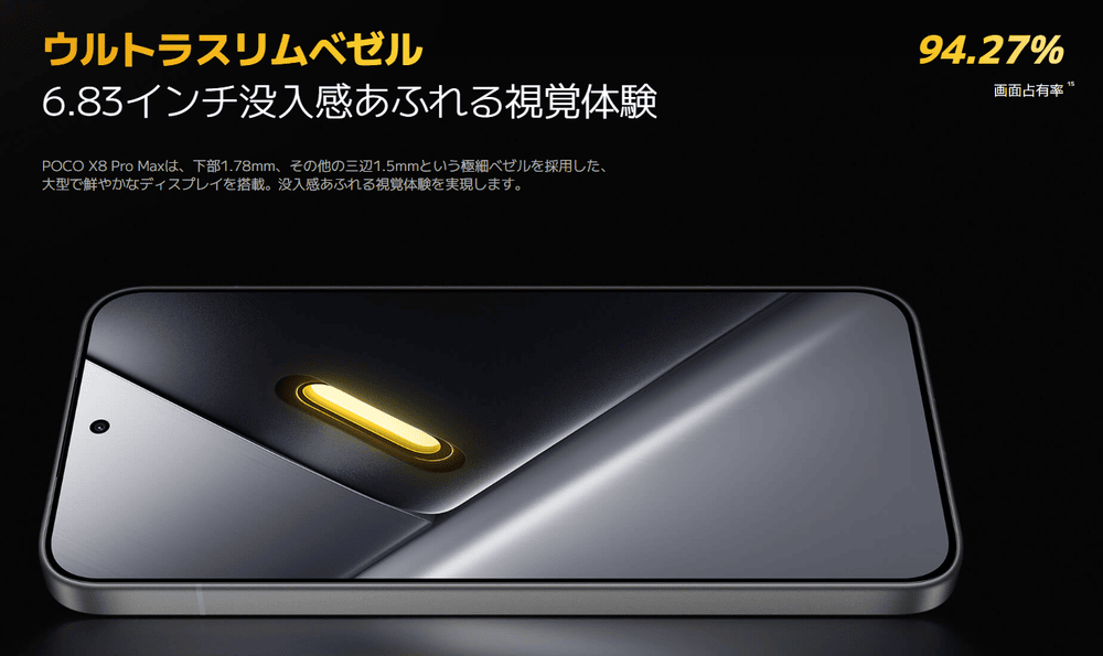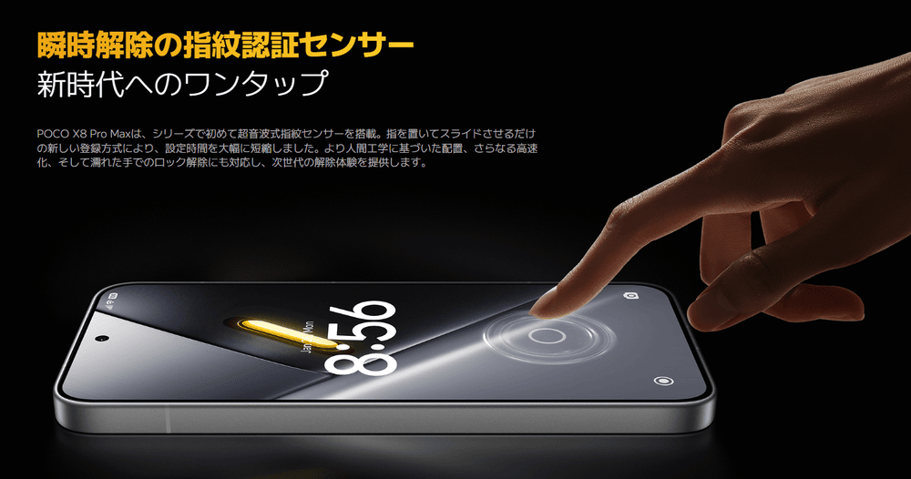 「X8 Pro Max」は、POCOシリーズ初の超音波式指紋認証となっています。