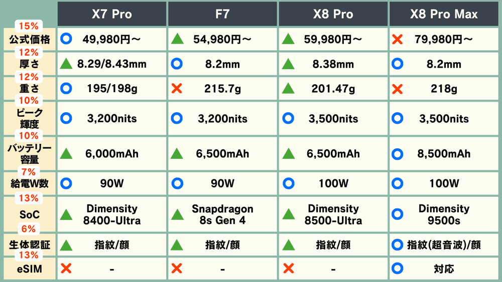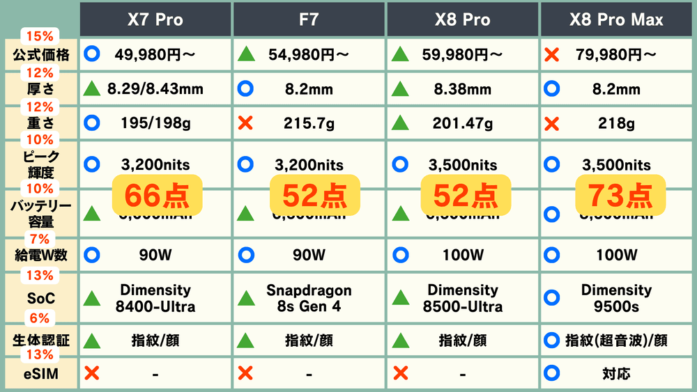 〇を1点、△を0.5点、✕を0点とすると、「X7 Pro」が66点、「F7」が52点、「X8 Pro」が52点、「X8 Pro Max」が73点になりました!