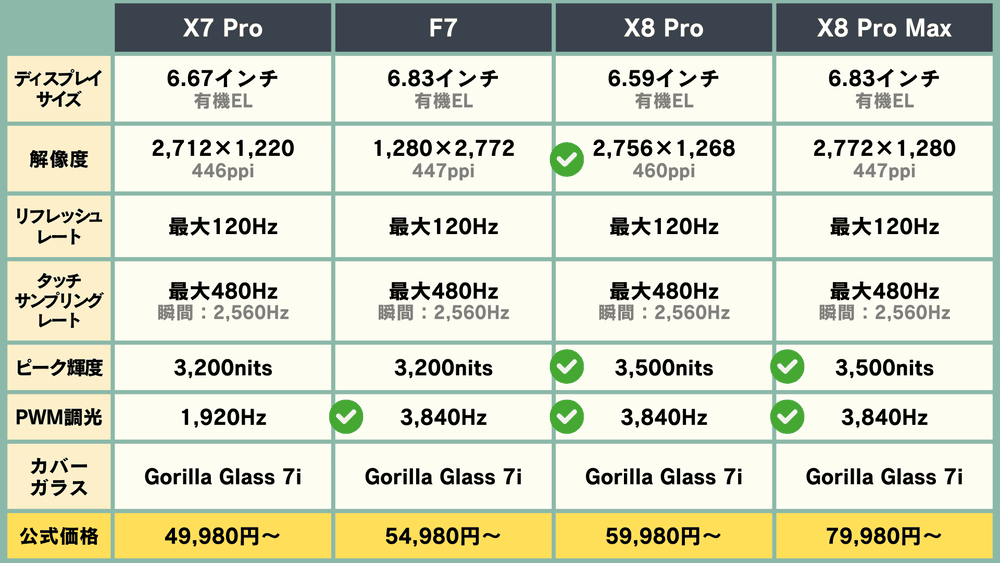 ピーク輝度は、「X7 Pro」と「F7」が3,200nitsで十分明るいですが、「X8 Pro」と「X8 ProMax」はさらに明るい3,500nits。