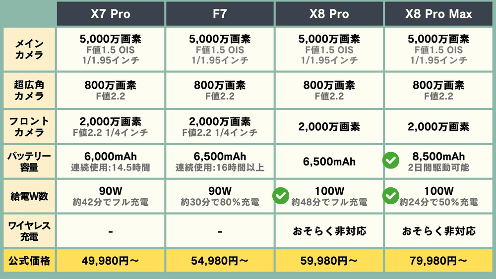 バッテリー容量は、「X7 Pro」が6,000mAh、「F7」と「X8 Pro」が6,500mAh、「X8 Pro Max」が8,500mAhとなっています。