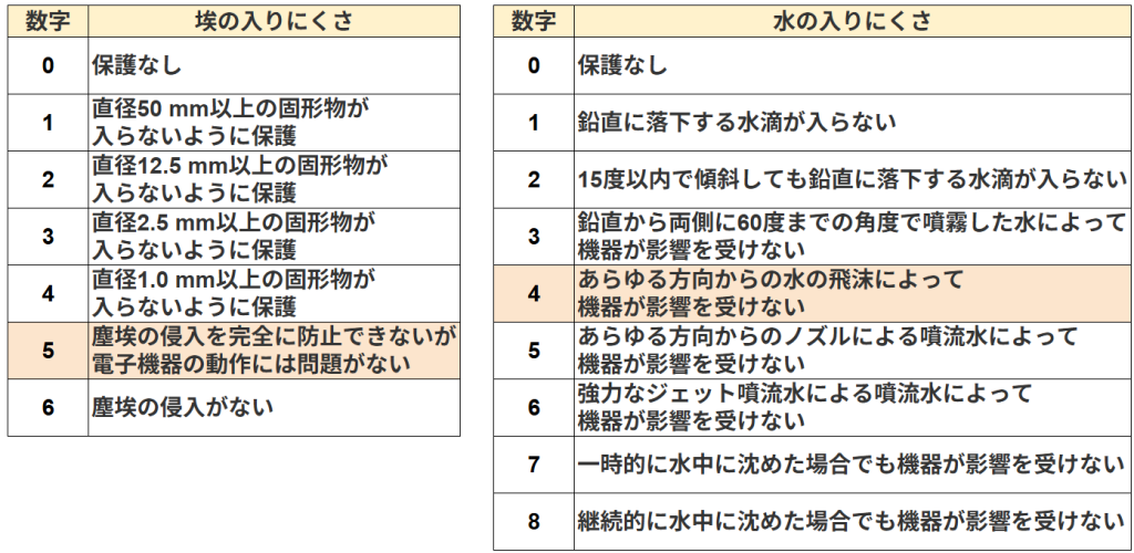 防水性能が「4」の場合、「あらゆる方向からの水の飛沫によって機器が影響を受けないレベル」となっているので、ちょっと濡れる分には問題ないですが、長時間雨にぬれたり、水中に落としてしまうと故障してしまう可能性があります。