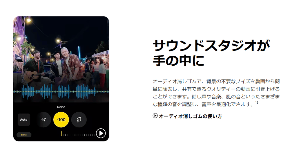 他にも、フィルター機能や、最近CMでよく見る、オーディオ消しゴムという、動画の不要なノイズを消す機能などもあったりします。