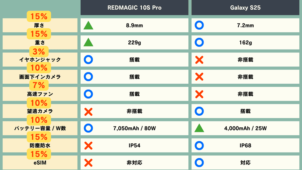 〇✕△は主観です。各項目の個人的な重要度を%で表しています。