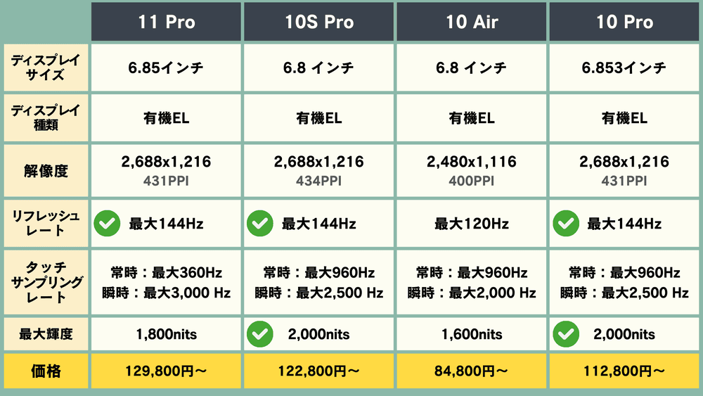 最大輝度は、「10S Pro」が一番高く、2,000nits。