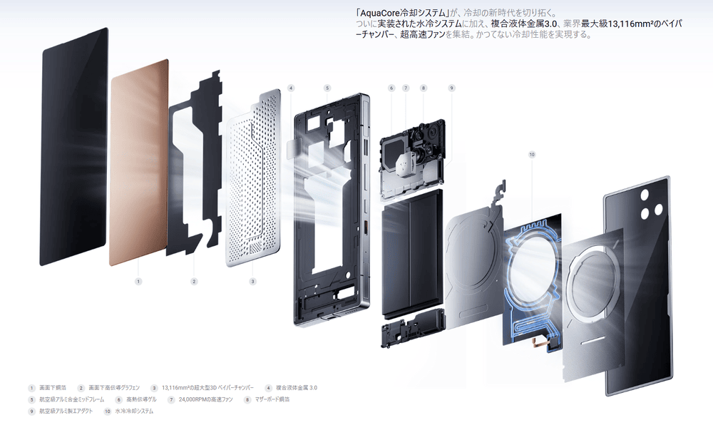 「10 Air」は水冷システムや高速ファンはありませんが、ベイパーチャンバーや複合液体金属による十分な冷却システムが備わっています。