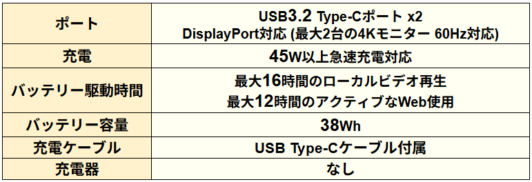 バッテリー容量は38Whで、最大16時間の動画再生が可能です。