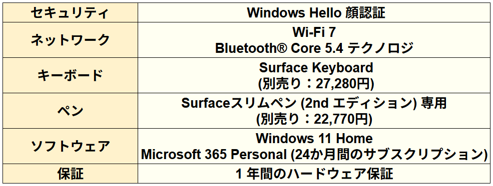 その他、セキュリティやネットワーク、ソフトウェアはこちらの表のとおりです。