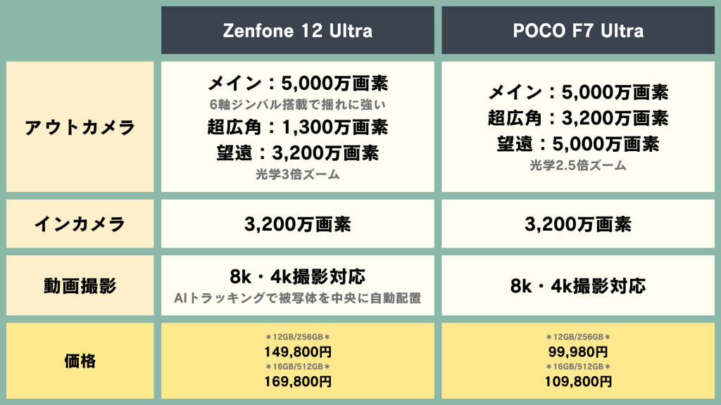今回は、2025年5月30日発売の「Zenfone 12 Ultra」と、スペックが近い、高コスパのスマホ「POCO F7 Ultra」を比較していきます!